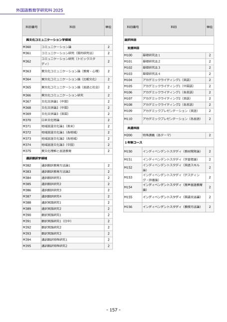 外国語教育学研究科2025科目番号科目単位科目番号科目単位選択科目支援科目M100M101M102M103M104M105M106M107M108M109M110基礎研究法1基礎研究法2基礎研究法3基礎研究法4アカデミックライティング1(英語)アカデミックライティング1(中国語)アカデミックライティング1(各言語)アカデミックライティング2(英語)アカデミックライティング2(各言語)アカデミックプレゼンテーション(英語)アカデミックプレゼンテーション(各言語)共通科目M200特殊講義(各テーマ)1年制コースM150M151M152M153M154M155M156インディペンデントスタディ(教材開発論)インディペンデントスタディ(学習者論)インディペンデントスタディ(英語スキル論)インディペンデントスタディ(テスティング・評価論)インディペンデントスタディ(音声言語教育論)インディペンデントスタディ(英語文法論)インディペンデントスタディ(教授方法論)2222222222222222222222222222222222222222222222222-157-異文化コミュニケーション学領域M360M361M362M363M364M365M366M367M368M369M370M371M372M373M374M375コミュニケーション論コミュニケーション研究(質的研究法)コミュニケーション研究(トピックスタディ)異文化コミュニケーション論(教育・心理)異文化コミュニケーション論(比較文化)異文化コミュニケーション論(言語と社会)異文化コミュニケーション研究文化交渉論1(中国)文化交渉論2(中国)文化交渉論3(英国)日本文化特論地域言語文化論1(英米)地域言語文化論1(各地域)地域言語文化論2(各地域)地域言語文化論3(中国)異文化理解と言語教育通訳翻訳学領域通訳翻訳教育方法論1通訳翻訳教育方法論2通訳翻訳研究1通訳翻訳研究2通訳翻訳研究3通訳翻訳研究4通訳実践研究1通訳実践研究2翻訳実践研究1翻訳実践研究1(日中)翻訳実践研究2翻訳実践研究3通訳翻訳特殊研究1通訳翻訳特殊研究2M382M383M384M385M386M387M388M389M390M391M392M393M394M395