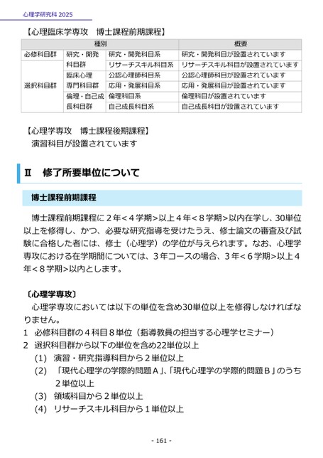 心理学研究科2025【心理臨床学専攻博士課程前期課程】種別概要必修科目群選択科目群研究・開発科目群臨床心理専門科目群倫理・自己成長科目群研究・開発科目系リサーチスキル科目系公認心理師科目系応用・発展科目系倫理科目系自己成長科目系研究・開発科目が設置されていますリサーチスキル科目が設置されています公認心理師科目が設置されています応用・発展科目が設置されています倫理科目が設置されています自己成長科目が設置されています心理学専攻演習科目が設置されています博士課程後期課程】【修了所要単位についてⅡ博士課程前期課程博士課程前期課程に2年<4学期>以上4年<8学期>以内在学し、30単位以上を修得し、かつ、必要な研究指導を受けたうえ、修士論文の審査及び試験に合格した者には、修士(心理学)の学位が与えられます。なお、心理学専攻における在学期間については、3年コースの場合、3年<6学期>以上4年<8学期>以内とします。心理学専攻〕心理学専攻においては以下の単位を含め30単位以上を修得しなければな〔りません。1必修科目群の4科目8単位(指導教員の担当する心理学セミナー)2選択科目群から以下の単位を含め22単位以上(1)(2)(3)(4)演習・研究指導科目から2単位以上「現代心理学の学際的問題A」、「現代心理学の学際的問題B」のうち2単位以上領域科目から2単位以上リサーチスキル科目から1単位以上-161-