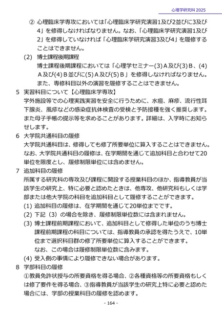 心理学研究科2025②心理臨床学専攻においては「心理臨床学研究演習1及び2並びに3及び4」を修得しなければなりません。なお、「心理臨床学研究演習1及び2」を修得していなければ「心理臨床学研究演習3及び4」を履修することはできません。博士課程後期課程博士課程後期課程においては「心理学セミナー(3)A及び(3)B、(4)A及び(4)B並びに(5)A及び(5)B」を修得しなければなりません。また、専修科目以外の演習を履修することはできません。(2)5実習科目について【心理臨床学専攻】学外施設等での心理実践実習を安全に行うために、水痘、麻疹、流行性耳下腺炎、風疹などの感染症抗体検査の受検と予防接種を強く推奨します。また母子手帳の提示等を求めることがあります。詳細は、入学時にお知らせします。6大学院共通科目の履修大学院共通科目は、修得しても修了所要単位に算入することはできません。なお、大学院共通科目の履修は、在学期間を通じて追加科目と合わせて20単位を限度とし、履修制限単位には含めません。7追加科目の履修所属する研究科の専攻及び課程に開設する授業科目のほか、指導教員が当該学生の研究上、特に必要と認めたときは、他専攻、他研究科もしくは学部または他大学院の科目を追加科目として履修することができます。(1)追加科目の履修は、在学期間を通じて20単位までです。(2)下記(3)の場合を除き、履修制限単位数には含まれません。(3)博士課程前期課程において、追加科目として修得した単位のうち博士課程前期課程の科目については、指導教員の承認を得たうえで、10単位まで選択科目群の修了所要単位に算入することができます。なお、この場合は履修制限単位数に含みます。(4)受入側の事情により履修できない場合があります。8学部科目の履修①教員免許状授与の所要資格を得る場合、②各種資格等の所要資格もしくは修了要件を得る場合、③指導教員が当該学生の研究上特に必要と認めた場合には、学部の授業科目の履修を認めます。-164-