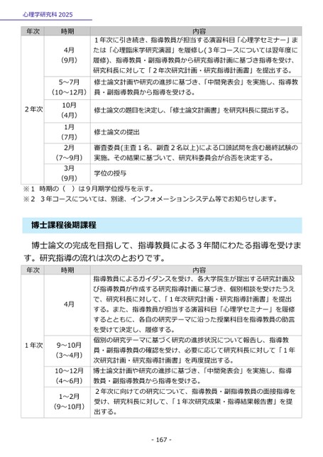 心理学研究科2025年次時期2年次4月(9月)5~7月(10~12月)10月(4月)1月(7月)2月(7~9月)3月(9月)内容1年次に引き続き、指導教員が担当する演習科目「心理学セミナー」または「心理臨床学研究演習」を履修し(3年コースについては翌年度に履修)、指導教員・副指導教員から研究指導計画に基づき指導を受け、研究科長に対して「2年次研究計画・研究指導計画書」を提出する。修士論文計画や研究の進捗に基づき、「中間発表会」を実施し、指導教員・副指導教員から指導を受ける。修士論文の題目を決定し、「修士論文計画書」を研究科長に提出する。修士論文の提出審査委員(主査1名、副査2名以上)による口頭試問を含む最終試験の実施。その結果に基づいて、研究科委員会が合否を決定する。学位の授与※1時期の(※23年コースについては、別途、インフォメーションシステム等でお知らせします。)は9月期学位授与を示す。士課程後期課程博博士論文の完成を目指して、指導教員による3年間にわたる指導を受けます。研究指導の流れは次のとおりです。年次時期4月9~10月(3~4月)10~12月(4~6月)1~2月(9~10月)1年次内容指導教員によるガイダンスを受け、各大学院生が提出する研究計画及び指導教員が作成する研究指導計画に基づき、個別相談を受けたうえで、研究科長に対して、「1年次研究計画・研究指導計画書」を提出する。また、指導教員が担当する演習科目「心理学セミナー」を履修するとともに、各自の研究テーマに沿った授業科目を指導教員の助言を受けて決定し、履修する。個別の研究テーマに基づく研究の進捗状況について報告し、指導教員・副指導教員の確認を受け、必要に応じて研究科長に対して「1年次研究計画・研究指導計画書」を再度提出する。博士論文計画や研究の進捗に基づき、「中間発表会」を実施し、指導教員・副指導教員から指導を受ける。2年次に向けての研究について、指導教員・副指導教員の面接指導を受け、研究科長に対して、「1年次研究成果・指導結果報告書」を提出する。-167-