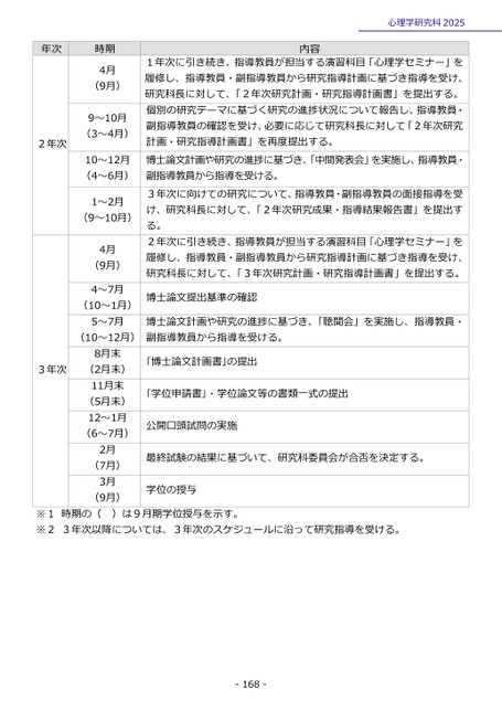 年次2年次時期4月(9月)9~10月(3~4月)10~12月(4~6月)1~2月(9~10月)4月(9月)4~7月(10~1月)5~7月(10~12月)8月末3年次(2月末)11月末(5月末)12~1月(6~7月)2月(7月)3月(9月)心理学研究科2025内容1年次に引き続き、指導教員が担当する演習科目「心理学セミナー」を履修し、指導教員・副指導教員から研究指導計画に基づき指導を受け、研究科長に対して、「2年次研究計画・研究指導計画書」を提出する。個別の研究テーマに基づく研究の進捗状況について報告し、指導教員・副指導教員の確認を受け、必要に応じて研究科長に対して「2年次研究計画・研究指導計画書」を再度提出する。博士論文計画や研究の進捗に基づき、「中間発表会」を実施し、指導教員・副指導教員から指導を受ける。3年次に向けての研究について、指導教員・副指導教員の面接指導を受け、研究科長に対して、「2年次研究成果・指導結果報告書」を提出する。2年次に引き続き、指導教員が担当する演習科目「心理学セミナー」を履修し、指導教員・副指導教員から研究指導計画に基づき指導を受け、研究科長に対して、「3年次研究計画・研究指導計画書」を提出する。博士論文提出基準の確認博士論文計画や研究の進捗に基づき、「聴聞会」を実施し、指導教員・副指導教員から指導を受ける。「博士論文計画書」の提出「学位申請書」・学位論文等の書類一式の提出公開口頭試問の実施最終試験の結果に基づいて、研究科委員会が合否を決定する。学位の授与※1時期の(※23年次以降については、3年次のスケジュールに沿って研究指導を受ける。)は9月期学位授与を示す。-168-