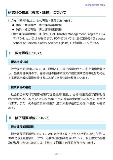 社会安全研究科2025研究科の構成(専攻・課程)について社会安全研究科には、次の専攻・課程があります。防災・減災専攻防災・減災専攻博士課程前期課程博士課程後期課程※博士課程後期課程には「Ph.D.ofDisasterManagementProgram」(以下「PDM」という。)があります。PDMについては、別に定める「GraduateSchoolofSocietalSafetySciences(PDM)」を確認してください。教育課程についてⅠ研究指導体制社会安全研究科においては、原則として専任教員のうち1名を指導教員とし、当該指導教員の下、履修科目の指導や論文作成に関する指導をはじめとする研究全般の指導を受けることができる体制を整えています。業科目の構成授社会安全研究科で履修・修得できる授業科目は、必修科目群(必ず修得しなければならない科目)と選択科目群(一定の選択の余地がある科目)に大別されます。また、その他に自由科目群(修了所要単位に含めない科目)があります。Ⅱ修了所要単位について博士課程前期課程博士課程前期課程において、2年<4学期>以上(4年<8学期>以内)在学し、30単位以上を修得し、かつ、必要な研究指導を受けたうえ、修士論文の審査及び試験に合格した者には、「修士(学術)」の学位が与えられます。-174-