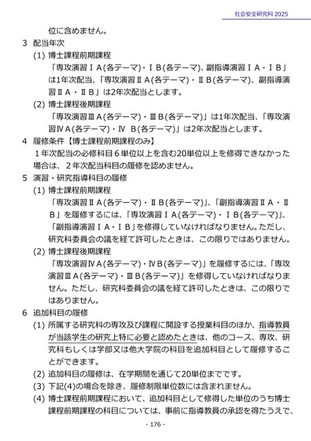 位に含めません。3配当年次(1)博士課程前期課程社会安全研究科2025「専攻演習ⅠA(各テーマ)・ⅠB(各テーマ)、副指導演習ⅠA・ⅠB」は1年次配当、「専攻演習ⅡA(各テーマ)・ⅡB(各テーマ)、副指導演習ⅡA・ⅡB」は2年次配当とします。(2)博士課程後期課程「専攻演習ⅢA(各テーマ)・ⅢB(各テーマ)」は1年次配当、「専攻演習ⅣA(各テーマ)・ⅣB(各テーマ)」は2年次配当とします。4履修条件【博士課程前期課程のみ】1年次配当の必修科目6単位以上を含む20単位以上を修得できなかった場合は、2年次配当科目の履修を認めません。5演習・研究指導科目の履修(1)博士課程前期課程「専攻演習ⅡA(各テーマ)・ⅡB(各テーマ)」、「副指導演習ⅡA・ⅡB」を履修するには、「専攻演習ⅠA(各テーマ)・ⅠB(各テーマ)」、「副指導演習ⅠA・ⅠB」を修得していなければなりません。ただし、研究科委員会の議を経て許可したときは、この限りではありません。(2)博士課程後期課程「専攻演習ⅣA(各テーマ)・ⅣB(各テーマ)」を履修するには、「専攻演習ⅢA(各テーマ)・ⅢB(各テーマ)」を修得していなければなりません。ただし、研究科委員会の議を経て許可したときは、この限りではありません。6追加科目の履修(1)所属する研究科の専攻及び課程に開設する授業科目のほか、指導教員が当該学生の研究上特に必要と認めたときは、他のコース、専攻、研究科もしくは学部又は他大学院の科目を追加科目として履修することができます。(2)追加科目の履修は、在学期間を通じて20単位までです。(3)下記(4)の場合を除き、履修制限単位数には含まれません。(4)博士課程前期課程において、追加科目として修得した単位のうち博士課程前期課程の科目については、事前に指導教員の承認を得たうえで、-176-