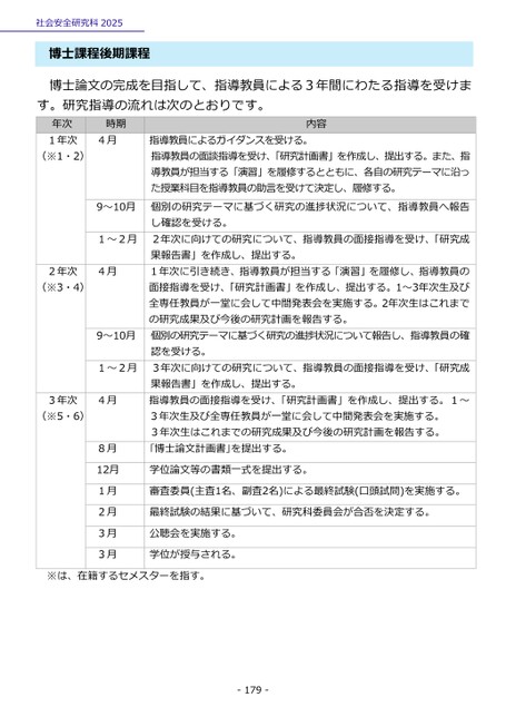 社会安全研究科2025博士課程後期課程博士論文の完成を目指して、指導教員による3年間にわたる指導を受けます。研究指導の流れは次のとおりです。年次1年次時期4月(※1・2)9~10月1~2月2年次4月(※3・4)9~10月1~2月3年次4月(※5・6)8月12月1月2月3月3月内容指導教員によるガイダンスを受ける。指導教員の面談指導を受け、「研究計画書」を作成し、提出する。また、指導教員が担当する「演習」を履修するとともに、各自の研究テーマに沿った授業科目を指導教員の助言を受けて決定し、履修する。個別の研究テーマに基づく研究の進捗状況について、指導教員へ報告し確認を受ける。2年次に向けての研究について、指導教員の面接指導を受け、「研究成果報告書」を作成し、提出する。1年次に引き続き、指導教員が担当する「演習」を履修し、指導教員の面接指導を受け、「研究計画書」を作成し、提出する。1~3年次生及び全専任教員が一堂に会して中間発表会を実施する。2年次生はこれまでの研究成果及び今後の研究計画を報告する。個別の研究テーマに基づく研究の進捗状況について報告し、指導教員の確認を受ける。3年次に向けての研究について、指導教員の面接指導を受け、「研究成果報告書」を作成し、提出する。指導教員の面接指導を受け、「研究計画書」を作成し、提出する。1~3年次生及び全専任教員が一堂に会して中間発表会を実施する。3年次生はこれまでの研究成果及び今後の研究計画を報告する。「博士論文計画書」を提出する。学位論文等の書類一式を提出する。審査委員(主査1名、副査2名)による最終試験(口頭試問)を実施する。最終試験の結果に基づいて、研究科委員会が合否を決定する。公聴会を実施する。学位が授与される。※は、在籍するセメスターを指す。-179-