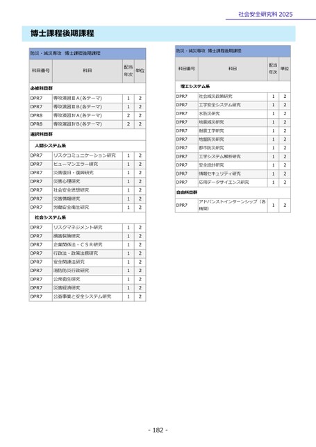 社会安全研究科2025防災・減災専攻博士課程後期課程科目番号科目理工システム系DPR7DPR7DPR7DPR7DPR7DPR7DPR7DPR7DPR7DPR7DPR7社会減災政策研究工学安全システム研究水防災研究地震減災研究耐震工学研究地盤防災研究都市防災研究工学システム解析研究安全設計研究情報セキュリティ研究応用データサイエンス研究自由科目群DPR7アドバンストインターンシップ(各機関)配当年次単位111111111111222222222222博士課程後期課程防災・減災専攻博士課程後期課程科目番号科目必修科目群DPR7DPR7DPR8DPR8専攻演習ⅢA(各テーマ)専攻演習ⅢB(各テーマ)専攻演習ⅣA(各テーマ)専攻演習ⅣB(各テーマ)選択科目群人間システム系DPR7DPR7DPR7DPR7DPR7DPR7DPR7リスクコミュニケーション研究ヒューマンエラー研究災害復旧・復興研究災害心理研究社会安全思想研究災害情報研究労働安全衛生研究社会システム系DPR7DPR7DPR7DPR7DPR7DPR7DPR7DPR7DPR7リスクマネジメント研究損害保険研究企業関係法・CSR研究行政法・政策法務研究安全関連法研究消防防災行政研究公衆衛生研究災害経済研究公益事業と安全システム研究配当年次単位1122111111111111111122222222222222222222-182-