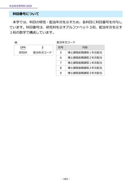 社会安全研究科2025科目番号について本学では、科目の特性・配当年次を示すため、各科目に科目番号を付与しています。科目番号は、研究科を示すアルファベット3桁、配当年次を示す1桁の数字で構成しています。例DPR研究科5配当年次コード記号内容配当年次コード56789博士課程前期課程1年次配当博士課程前期課程2年次配当博士課程後期課程1年次配当博士課程後期課程2年次配当博士課程後期課程3年次配当-183-