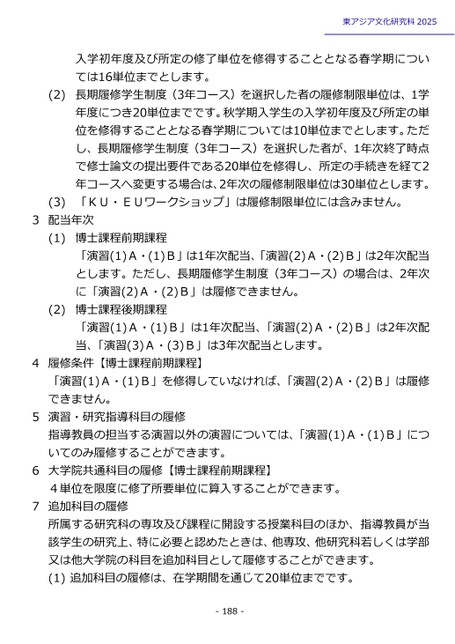 東アジア文化研究科2025入学初年度及び所定の修了単位を修得することとなる春学期については16単位までとします。長期履修学生制度(3年コース)を選択した者の履修制限単位は、1学年度につき20単位までです。秋学期入学生の入学初年度及び所定の単位を修得することとなる春学期については10単位までとします。ただし、長期履修学生制度(3年コース)を選択した者が、1年次終了時点で修士論文の提出要件である20単位を修得し、所定の手続きを経て2年コースへ変更する場合は、2年次の履修制限単位は30単位とします。「KU・EUワークショップ」は履修制限単位には含みません。(2)(3)3配当年次(1)(2)博士課程前期課程「演習(1)A・(1)B」は1年次配当、「演習(2)A・(2)B」は2年次配当とします。ただし、長期履修学生制度(3年コース)の場合は、2年次に「演習(2)A・(2)B」は履修できません。博士課程後期課程「演習(1)A・(1)B」は1年次配当、「演習(2)A・(2)B」は2年次配当、「演習(3)A・(3)B」は3年次配当とします。4履修条件【博士課程前期課程】「演習(1)A・(1)B」を修得していなければ、「演習(2)A・(2)B」は履修できません。5演習・研究指導科目の履修指導教員の担当する演習以外の演習については、「演習(1)A・(1)B」についてのみ履修することができます。6大学院共通科目の履修【博士課程前期課程】4単位を限度に修了所要単位に算入することができます。7追加科目の履修所属する研究科の専攻及び課程に開設する授業科目のほか、指導教員が当該学生の研究上、特に必要と認めたときは、他専攻、他研究科若しくは学部又は他大学院の科目を追加科目として履修することができます。(1)追加科目の履修は、在学期間を通じて20単位までです。-188-