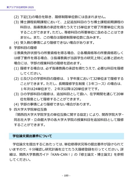 (2)下記(3)の場合を除き、履修制限単位数には含まれません。(3)博士課程前期課程において、上記追加科目のうち博士課程前期課程の科目は、指導教員の承認を得たうえで15単位まで修了所要単位に充当することができます。ただし、専修科目の所要単位に含めることはできません。また、この場合は履修制限単位数に含みます。(4)受入側の事情により履修できない場合があります。8学部科目の履修①教員免許状授与の所要資格を得る場合、②各種資格等の所要資格若しくは修了要件を得る場合、③指導教員が当該学生の研究上特に必要と認めた場合には、学部の授業科目の履修を認めます。(1)履修する場合は、必ず指導教員の承認を得たうえで、必要な科目を履修してください。(2)①及び②の学部科目の履修は、1学年度において32単位まで履修することができます。ただし、長期履修学生制度(3年コース)の場合は、1年次は24単位まで、2年次以降は20単位までです。(3)③の学部科目の履修は、追加科目として扱い、在学期間を通じて20単位を限度として履修することができます。(4)学部の事情により履修できない場合があります。9四大学大学院単位互換「関西四大学大学院学生の単位互換に関する協定」により、関西学院大学・同志社大学・立命館大学の各大学大学院の授業科目を追加科目として履修することができます。位論文提出要件について学学位論文を提出するにあたっては、単位修得状況等の提出要件が設けられていますので、十分確認し研究計画を立てたうえ履修登録を行ってください。詳細は、関西大学教務ガイド「KAN-CAN!」の『修士論文・博士論文』を参照してください。-189-東アジア文化研究科2025