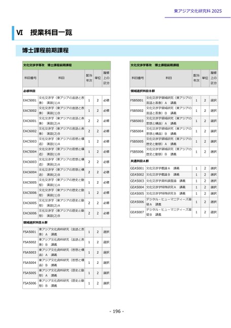 東アジア文化研究科2025Ⅵ授業科目一覧博士課程前期課程履修上の区分選択選択選択選択選択選択選択選択選択選択選択選択選択科目番号科目配当年次単位領域選択科目B群FSB5001FSB5002FSB5003FSB5004FSB5005FSB5006文化交渉学領域研究(東アジアの言語と表象)A講義文化交渉学領域研究(東アジアの言語と表象)B講義文化交渉学領域研究(東アジアの思想と構造)A講義文化交渉学領域研究(東アジアの思想と構造)B講義文化交渉学領域研究(東アジアの歴史と動態)A講義文化交渉学領域研究(東アジアの歴史と動態)B講義共通科目A群GEA5001文化交渉学概論A講義GEA5002文化交渉学概論B講義GEA5003文化交渉学資料調査論講義GEA5004文化交渉学特殊研究A講義GEA5005GEA5006GEA5007文化交渉学特殊研究B講義デジタル・ヒューマニティーズ基礎A講義デジタル・ヒューマニティーズ基礎B講義11111111111112222222222222科目番号科目配当年次単位必修科目EAC5001EAC5002EAC6001EAC6002EAC5003EAC5004EAC6003EAC6004EAC5005EAC5006EAC6005EAC6006文化交渉学(東アジアの言語と表象)演習(1)A文化交渉学(東アジアの言語と表象)演習(1)B文化交渉学(東アジアの言語と表象)演習(2)A文化交渉学(東アジアの言語と表象)演習(2)B文化交渉学(東アジアの思想と構造)演習(1)A文化交渉学(東アジアの思想と構造)演習(1)B文化交渉学(東アジアの思想と構造)演習(2)A文化交渉学(東アジアの思想と構造)演習(2)B文化交渉学(東アジアの歴史と動態)演習(1)A文化交渉学(東アジアの歴史と動態)演習(1)B文化交渉学(東アジアの歴史と動態)演習(2)A文化交渉学(東アジアの歴史と動態)演習(2)B領域選択科目A群FSA5001FSA5002FSA5003FSA5004FSA5005FSA5006東アジア文化資料研究(言語と表象)A講義東アジア文化資料研究(言語と表象)B講義東アジア文化資料研究(思想と構造)A講義東アジア文化資料研究(思想と構造)B講義東アジア文化資料研究(歴史と動態)A講義東アジア文化資料研究(歴史と動態)B講義112211221122111111222222222222222222履修上の区分必修必修必修必修必修必修必修必修必修必修必修必修選択選択選択選択選択選択-196-文化交渉学専攻博士課程前期課程文化交渉学専攻博士課程前期課程