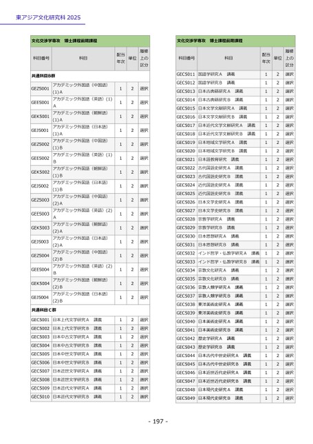 -197-東アジア文化研究科2025文化交渉学専攻博士課程前期課程科目番号科目配当年次単位上の履修区分共通科目B群GEZ5001アカデミック外国語(日本語)(2)BBアカデミック外国語(英語)(2)(2)B(2)Aアカデミック外国語(日本語)(2)AAアカデミック外国語(英語)(2)(2)A(1)Bアカデミック外国語(日本語)アカデミック外国語(朝鮮語)Bアカデミック外国語(英語)(1)アカデミック外国語(中国語)(1)Aアカデミック外国語(日本語)アカデミック外国語(朝鮮語)Aアカデミック外国語(英語)(1)アカデミック外国語(中国語)(1)A(1)A(1)B(1)Bアカデミック外国語(中国語)アカデミック外国語(朝鮮語)アカデミック外国語(中国語)アカデミック外国語(朝鮮語)(2)B12選択GEE500112選択GEK500112選択GEJ500112選択GEZ500212選択GEE500212選択GEK500212選択GEJ500212選択GEZ500312選択GEE500312選択GEK500312選択GEJ500312選択GEZ500412選択GEE500412選択GEK500412選択GEJ500412選択共通科目C群GEC5001日本上代文学研究A講義12選択GEC5002日本上代文学研究B講義12選択GEC5003日本中古文学研究A講義12選択GEC5004日本中古文学研究B講義12選択GEC5005日本中世文学研究A講義12選択GEC5006日本中世文学研究B講義12選択GEC5007日本近世文学研究A講義12選択GEC5008日本近世文学研究B講義12選択GEC5009日本近代文学研究A講義12選択GEC5010日本近代文学研究B講義12選択文化交渉学専攻博士課程前期課程科目番号科目配当年次単位上の履修区分GEC5011国語学研究A講義12選択GEC5012国語学研究B講義12選択GEC5013日本古典籍研究A講義12選択GEC5014日本古典籍研究B講義12選択GEC5015日本文学文献研究A講義12選択GEC5016日本文学文献研究B講義12選択GEC5017日本近代文学文献研究A講義12選択GEC5018日本近代文学文献研究B講義12選択GEC5019日本地域文学研究A講義12選択GEC5020日本地域文学研究B講義12選択GEC5021日本語教育研究講義12選択GEC5022古代国語史研究A講義12選択GEC5023古代国語史研究B講義12選択GEC5024近代国語史研究A講義12選択GEC5025近代国語史研究B講義12選択GEC5026日本文学史研究A講義12選択GEC5027日本文学史研究B講義12選択GEC5028宗教学研究A講義12選択GEC5029宗教学研究B講義12選択GEC5030日本思想研究A講義12選択GEC5031日本思想研究B講義12選択GEC5032インド哲学・仏教学研究A講義12選択GEC5033インド哲学・仏教学研究B講義12選択GEC5034宗教文化研究A講義12選択GEC5035宗教文化研究B講義12選択GEC5036宗教人類学研究A講義12選択GEC5037宗教人類学研究B講義12選択GEC5038東洋美術史研究A講義12選択GEC5039東洋美術史研究B講義12選択GEC5040日本美術史研究A講義12選択GEC5041日本美術史研究B講義12選択GEC5042歴史学研究A講義12選択GEC5043歴史学研究B講義12選択GEC5044日本古代中世史研究A講義12選択GEC5045日本古代中世史研究B講義12選択GEC5046日本近世近代史研究A講義12選択GEC5047日本近世近代史研究B講義12選択GEC5048日本現代史研究A講義12選択GEC5049日本現代史研究B講義12選択