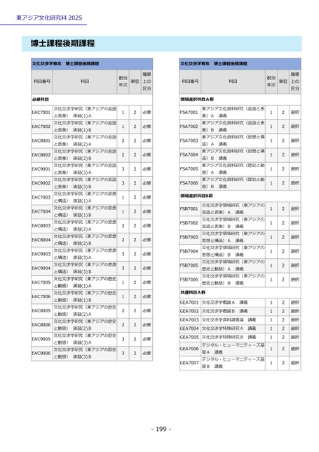 履修上の区分選択選択選択選択選択選択選択選択選択選択選択選択選択選択選択選択選択選択選択文化交渉学専攻博士課程後期課程文化交渉学専攻博士課程後期課程科目番号科目配当年次単位必修科目EAC7001EAC7002EAC8001EAC8002EAC9001EAC9002EAC7003EAC7004EAC8003EAC8004EAC9003EAC9004EAC7005EAC7006EAC8005EAC8006EAC9005EAC9006文化交渉学研究(東アジアの言語と表象)演習(1)A文化交渉学研究(東アジアの言語と表象)演習(1)B文化交渉学研究(東アジアの言語と表象)演習(2)A文化交渉学研究(東アジアの言語と表象)演習(2)B文化交渉学研究(東アジアの言語と表象)演習(3)A文化交渉学研究(東アジアの言語と表象)演習(3)B文化交渉学研究(東アジアの思想と構造)演習(1)A文化交渉学研究(東アジアの思想と構造)演習(1)B文化交渉学研究(東アジアの思想と構造)演習(2)A文化交渉学研究(東アジアの思想と構造)演習(2)B文化交渉学研究(東アジアの思想と構造)演習(3)A文化交渉学研究(東アジアの思想と構造)演習(3)B文化交渉学研究(東アジアの歴史と動態)演習(1)A文化交渉学研究(東アジアの歴史と動態)演習(1)B文化交渉学研究(東アジアの歴史と動態)演習(2)A文化交渉学研究(東アジアの歴史と動態)演習(2)B文化交渉学研究(東アジアの歴史と動態)演習(3)A文化交渉学研究(東アジアの歴史と動態)演習(3)B112233112233112233222222222222222222履修上の区分必修必修必修必修必修必修必修必修必修必修必修必修必修必修必修必修必修必修科目番号科目配当年次単位領域選択科目A群FSA7001FSA7002FSA7003FSA7004FSA7005FSA7006東アジア文化資料研究(言語と表象)A講義東アジア文化資料研究(言語と表象)B講義東アジア文化資料研究(思想と構造)A講義東アジア文化資料研究(思想と構造)B講義東アジア文化資料研究(歴史と動態)A講義東アジア文化資料研究(歴史と動態)B講義領域選択科目B群FSB7001FSB7002FSB7003FSB7004FSB7005FSB7006文化交渉学領域研究(東アジアの言語と表象)A講義文化交渉学領域研究(東アジアの言語と表象)B講義文化交渉学領域研究(東アジアの思想と構造)A講義文化交渉学領域研究(東アジアの思想と構造)B講義文化交渉学領域研究(東アジアの歴史と動態)A講義文化交渉学領域研究(東アジアの歴史と動態)B講義共通科目A群GEA7001文化交渉学概論A講義GEA7002文化交渉学概論B講義GEA7003文化交渉学資料調査論講義GEA7004文化交渉学特殊研究A講義GEA7005GEA7006GEA7007文化交渉学特殊研究B講義デジタル・ヒューマニティーズ基礎A講義デジタル・ヒューマニティーズ基礎B講義11111111111111111112222222222222222222-199-東アジア文化研究科2025博士課程後期課程