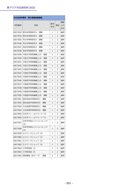 -201-配当年次単位111111111111111111111111111111111222222222222222222222222221111222履修上の区分選択選択選択選択選択選択選択選択選択選択選択選択選択選択選択選択選択選択選択選択選択選択選択選択選択選択選択選択選択選択選択選択選択文化交渉学専攻博士課程後期課程科目番号科目GEC7033東洋史特殊研究A講義GEC7034東洋史特殊研究B講義GEC7035考古学特殊研究A講義GEC7036考古学特殊研究B講義GEC7037民俗学特殊研究A講義GEC7038民俗学特殊研究B講義GEC7039中国文学特殊講義(1)A講義GEC7040中国文学特殊講義(1)B講義GEC7041中国文学特殊講義(2)A講義GEC7042中国文学特殊講義(2)B講義GEC7043中国哲学特殊講義(1)A講義GEC7044中国哲学特殊講義(1)B講義GEC7045中国哲学特殊講義(2)A講義GEC7046中国哲学特殊講義(2)B講義GEC7047中国語学特殊講義(1)A講義GEC7048中国語学特殊講義(1)B講義GEC7049中国語学特殊講義(2)A講義GEC7050中国語学特殊講義(2)B講義GEC7051歴史地誌学特殊研究A講義GEC7052歴史地誌学特殊研究B講義GEC7053文化地理学特殊研究A講義GEC7054文化地理学特殊研究B講義GEC7055日本学フィールドワーク(3)GEC7056GEC7057GEC7058GEC7059日本学フィールドワーク(4)日本学学術コミュニケーション・トレーニング(3)日本学学術コミュニケーション・トレーニング(4)KUワークショップ(3)GEC7060KUワークショップ(4)GEC7061EUワークショップ(3)GEC7062EUワークショップ(4)GEC7063大学院英語(3)GEC7064大学院英語(4)GEC7065寄附講座(各テーマ)講義東アジア文化研究科2025