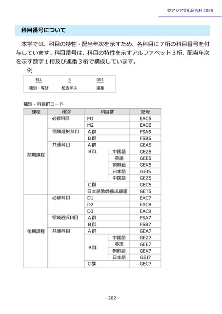 東アジア文化研究科2025科目番号について本学では、科目の特性・配当年次を示すため、各科目に7桁の科目番号を付与しています。科目番号は、科目の特性を示すアルファベット3桁、配当年次を示す数字1桁及び連番3桁で構成しています。例ELL5種別・専修配当年次001連番記号EAC5EAC6FSA5FSB5GEA5GEZ5GEE5GEK5GEJ5GEZ5GEC5GET5EAC7EAC8EAC9FSA7FSB7GEA7GEZ7GEE7GEK7GEJ7GEC7中国語英語朝鮮語日本語中国語C群日本語教師養成講座D1D2D3A群B群A群中国語英語朝鮮語日本語-202-種別・科目群コード課程種別必修科目領域選択科目共通科目前期課程M1M2A群B群A群B群科目群必修科目領域選択科目後期課程共通科目B群C群