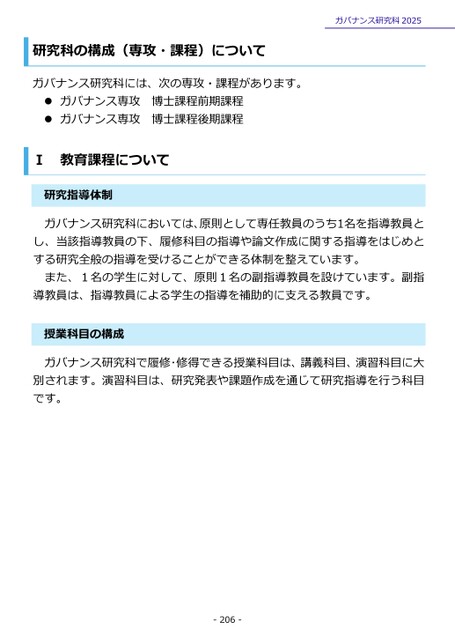ガバナンス研究科2025研究科の構成(専攻・課程)についてガバナンス研究科には、次の専攻・課程があります。ガバナンス専攻ガバナンス専攻博士課程前期課程博士課程後期課程教育課程についてⅠ研究指導体制ガバナンス研究科においては、原則として専任教員のうち1名を指導教員とし、当該指導教員の下、履修科目の指導や論文作成に関する指導をはじめとする研究全般の指導を受けることができる体制を整えています。また、1名の学生に対して、原則1名の副指導教員を設けています。副指導教員は、指導教員による学生の指導を補助的に支える教員です。業科目の構成授ガバナンス研究科で履修・修得できる授業科目は、講義科目、演習科目に大別されます。演習科目は、研究発表や課題作成を通じて研究指導を行う科目です。-206-