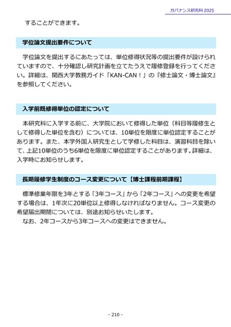 ガバナンス研究科2025位論文提出要件について学することができます。学位論文を提出するにあたっては、単位修得状況等の提出要件が設けられていますので、十分確認し研究計画を立てたうえで履修登録を行ってください。詳細は、関西大学教務ガイド「KAN-CAN!」の『修士論文・博士論文』を参照してください。入学前既修得単位の認定について本研究科に入学する前に、大学院において修得した単位(科目等履修生として修得した単位を含む)については、10単位を限度に単位認定することがあります。また、本学外国人研究生として学修した科目は、演習科目を除いて、上記10単位のうち6単位を限度に単位認定することがあります。詳細は、入学時にお知らせします。長期履修学生制度のコース変更について【博士課程前期課程】標準修業年限を3年とする「3年コース」から「2年コース」への変更を希望する場合は、1年次に20単位以上修得しなければなりません。コース変更の希望届出期間については、別途お知らせいたします。なお、2年コースから3年コースへの変更はできません。-210-