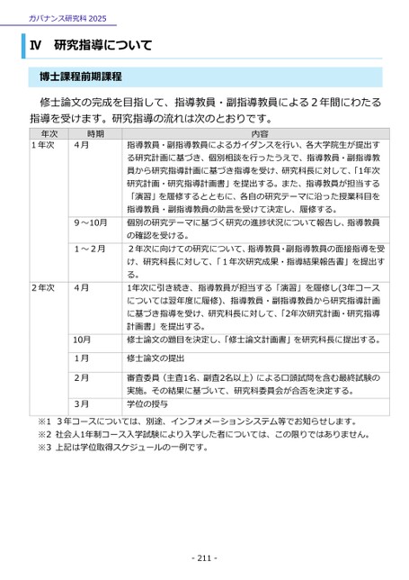 ガバナンス研究科2025Ⅳ研究指導について博士課程前期課程修士論文の完成を目指して、指導教員・副指導教員による2年間にわたる指導を受けます。研究指導の流れは次のとおりです。年次1年次時期4月9~10月1~2月2年次4月10月1月2月3月内容指導教員・副指導教員によるガイダンスを行い、各大学院生が提出する研究計画に基づき、個別相談を行ったうえで、指導教員・副指導教員から研究指導計画に基づき指導を受け、研究科長に対して、「1年次研究計画・研究指導計画書」を提出する。また、指導教員が担当する「演習」を履修するとともに、各自の研究テーマに沿った授業科目を指導教員・副指導教員の助言を受けて決定し、履修する。個別の研究テーマに基づく研究の進捗状況について報告し、指導教員の確認を受ける。2年次に向けての研究について、指導教員・副指導教員の面接指導を受け、研究科長に対して、「1年次研究成果・指導結果報告書」を提出する。1年次に引き続き、指導教員が担当する「演習」を履修し(3年コースについては翌年度に履修)、指導教員・副指導教員から研究指導計画に基づき指導を受け、研究科長に対して、「2年次研究計画・研究指導計画書」を提出する。修士論文の題目を決定し、「修士論文計画書」を研究科長に提出する。修士論文の提出審査委員(主査1名、副査2名以上)による口頭試問を含む最終試験の実施。その結果に基づいて、研究科委員会が合否を決定する。学位の授与※13年コースについては、別途、インフォメーションシステム等でお知らせします。※2社会人1年制コース入学試験により入学した者については、この限りではありません。※3上記は学位取得スケジュールの一例です。-211-