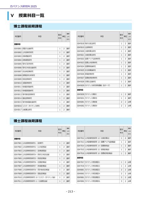 ガバナンス研究科2025Ⅴ授業科目一覧博士課程前期課程科目番号講義科目GOV5001調査方法論研究GOV5002公共政策学研究GOV5003政策規範研究GOV5004政策過程研究GOV5005現代行政学研究GOV5006現代日本政治論研究GOV5007自治体政策研究GOV5008数理経済分析研究GOV5009財政政策研究GOV5010金融政策研究GOV5011地域経済論研究GOV5012地域産業論研究GOV5013現代物流政策研究GOV5014福祉政策研究GOV5015現代地域福祉論研究GOV5016リスク・ガバナンス研究GOV5017比較憲法研究博士課程後期課程科目配当年次単位履修上の区分科目番号科目科目番号講義科目GOV7001公共政策特別研究1(政策学)GOV7002公共政策特別研究2(公共経営論)GOV7003公共政策特別研究3(政策過程論)GOV7004公共政策特別研究4(現代日本政治論)GOV7005公共政策特別研究5(財政政策論)GOV7006公共政策特別研究6(金融政策論)GOV7007公共政策特別研究7(地域産業論)GOV7008公共政策特別研究8(現代物流政策論)GOV7009公共政策特別研究9(福祉政策論)GOV7010公共政策特別研究10(リスク・ガバナンス論)GOV7011公共政策特別研究11(比較憲法論)1111111111122222222222GOV7012公共政策特別研究12(比較民事法)GOV7013公共政策特別研究13(国際アジア法政策論)GOV7014公共政策特別研究14(国際関係論)GOV7015公共政策特別研究15(貿易政策論)GOV7016公共政策特別研究16(国際経済政策論)演習科目GOV7017ガバナンス特別演習1GOV7018ガバナンス特別演習2GOV8001ガバナンス特別演習3GOV8002ガバナンス特別演習4GOV9001ガバナンス特別演習5GOV9002ガバナンス特別演習6選択選択選択選択選択選択選択選択選択選択選択-213-科目配当年次単位履修上の区分科目番号科目配当年次単位GOV5018現代行政法研究GOV5019法政策研究GOV5020比較刑事法研究GOV5021比較民事法研究GOV5022国際アジア法政策研究GOV5023国際公共政策研究GOV5024国際関係論研究GOV5025安全保障論研究GOV5026貿易政策研究GOV5027国際経済政策研究GOV5028空間社会論研究GOV5029ガバナンス研究特殊講義(各テーマ)演習科目GOV5030ガバナンス演習ⅠGOV5031ガバナンス演習ⅡGOV6001ガバナンス演習ⅢGOV6002ガバナンス演習Ⅳ1111111111111111122222222222222222選択選択選択選択選択選択選択選択選択選択選択選択選択選択選択選択選択履修上の区分選択選択選択選択選択選択選択選択選択選択選択選択選択選択必修必修履修上の区分選択選択選択選択選択必修必修必修必修必修必修11111111111111222222222222222222配当年次単位1111111223322222222222