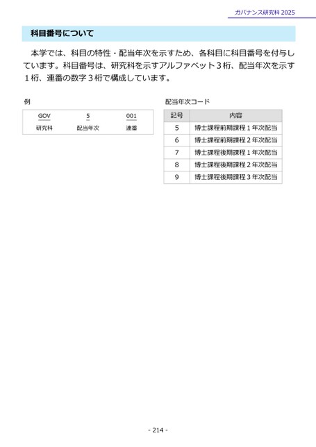 科目番号についてガバナンス研究科2025本学では、科目の特性・配当年次を示すため、各科目に科目番号を付与しています。科目番号は、研究科を示すアルファベット3桁、配当年次を示す1桁、連番の数字3桁で構成しています。例配当年次コード記号56789内容博士課程前期課程1年次配当博士課程前期課程2年次配当博士課程後期課程1年次配当博士課程後期課程2年次配当博士課程後期課程3年次配当GOV研究科5配当年次001連番-214-