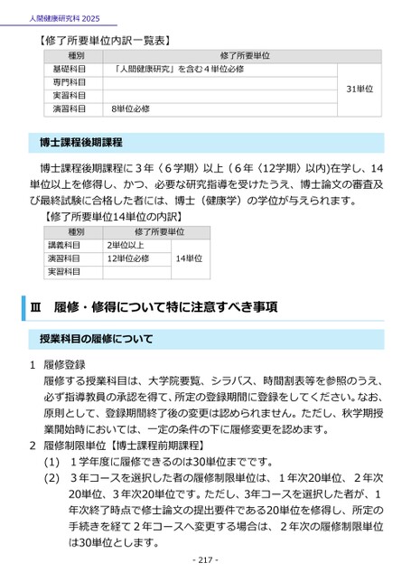 31単位人間健康研究科2025【修了所要単位内訳一覧表】種別基礎科目専門科目実習科目演習科目修了所要単位「人間健康研究」を含む4単位必修8単位必修士課程後期課程博博士課程後期課程に3年〈6学期〉以上(6年〈12学期〉以内)在学し、14単位以上を修得し、かつ、必要な研究指導を受けたうえ、博士論文の審査及び最終試験に合格した者には、博士(健康学)の学位が与えられます。【修了所要単位14単位の内訳】修了所要単位種別講義科目演習科目実習科目2単位以上12単位必修14単位Ⅲ履修・修得について特に注意すべき事項授業科目の履修について1履修登録履修する授業科目は、大学院要覧、シラバス、時間割表等を参照のうえ、必ず指導教員の承認を得て、所定の登録期間に登録をしてください。なお、原則として、登録期間終了後の変更は認められません。ただし、秋学期授業開始時においては、一定の条件の下に履修変更を認めます。履修制限単位【博士課程前期課程】(1)(2)1学年度に履修できるのは30単位までです。3年コースを選択した者の履修制限単位は、1年次20単位、2年次20単位、3年次20単位です。ただし、3年コースを選択した者が、1年次終了時点で修士論文の提出要件である20単位を修得し、所定の手続きを経て2年コースへ変更する場合は、2年次の履修制限単位は30単位とします。-217-2