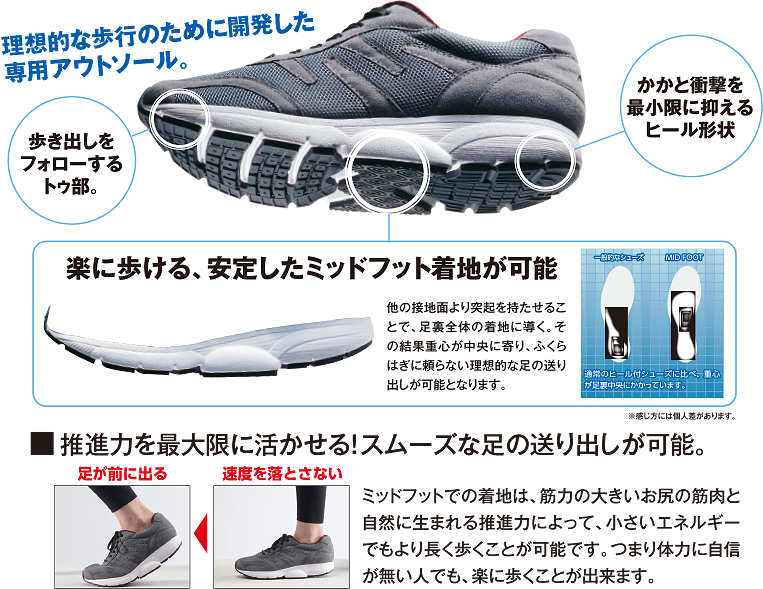足本来の構造からすると、足裏全体(ミッドフット)で着地する感覚で歩行をする事が2足歩行の人間にとって自然且つ良い歩き方と言えます。人間はお尻周りの筋肉が発達しているので、ミッドフット着地を実践する事で、人間が生まれ持つ大きな筋力を使って歩く事が出来ます。