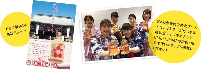 今年6月に社会学部・黒田勇ゼミが、大阪天満宮とハタ鉱泉株式会社とコラボして開発した聖産学連携商品・ご当地梅サイダー(飲料水)です。かつての名水・天満天神の水のリブランディングをめざし、学生らのアイデアをもとに生まれました。地域のさらなる賑わいと活性化を図るべく、ゼミ活動の一環として、日々PR活動に励んでいます!