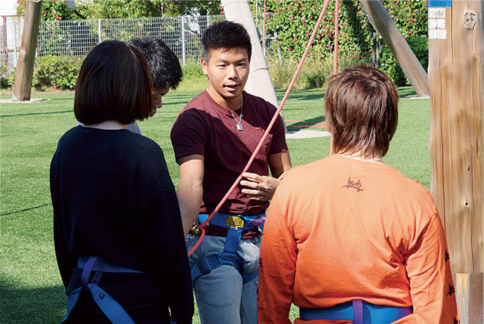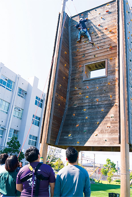 例えば「アドベンチャー教育」では、自由にグループを作り、堺キャンパスの体験学習エリアに設置されているエレメント専用器具に挑戦します。高さ10メートル以上あるクライミングタワーに登るためには必ず仲間の助けが必要となります。安全の確保はもちろんしっかり行いますが、命綱を握る仲間への信頼がなければ登ることはできません。登っている途中に高さへの恐怖心やあきらめの気持ちが襲ってきたときには、仲間の応援が大きな力になります。こうした冒険的な「場」が、学生自身が持っているチャレンジ精神や主体性、協調性、高いコミュニケーション能力を引き出すきっかけになっています。