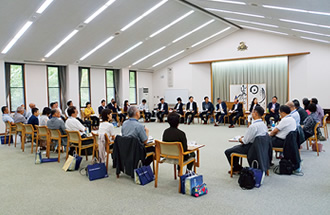 一行は9月21日(金)から二日間の日程で、明日香村にある関西大学飛鳥文化研究所・植田記念館を拠点に、「飛鳥めぐり」を楽しみながら、意見交換会を行いました。交換会ではまず北靖久会長が「父母・保護者の方の期待にこたられるような教育懇談会にするためにどうすれば良いのか。ぜひ皆さまの経験などをお聞かせいただき、今後の会のブラッシュアップに役立てたいと思います」と挨拶しました。
