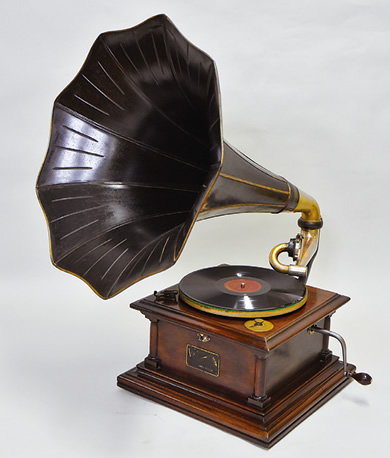 SPレコードのコンサートで使われる蓄音機は本後援会2017(平成29)年度会長、村岡基氏が寄贈しました。米国ビクター社のアウトサイドホーン蓄音機で、1901(明治34)年から30年近く販売されたロングセラー。2丁ゼンマイを内蔵し、朝顔形のホーンからは安定感のある演奏が楽しめる逸品です。