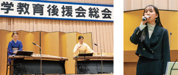午前中に行われた「教育後援会総会」は、本学の卒業生でアーティストのハナフサマユさんによる学歌の独唱からスタート。各種議事や来賓による挨拶のほか、応援団による演舞、最後に西陽子元客員教授と植野由美子氏による筝曲の演奏が行われ、総会に華が添えられました。
