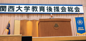 2023年度の教育後援会の事業および決算報告等の議事の後、1年間にわたり会長を務めた山本雅英氏と新会長に就任した阪本雅哉氏による挨拶がありました。来賓の挨拶では、芝井敬司理事長と前田裕学長が登壇し、吹田みらいキャンパスの展開や新学部構想とともに、ご父母の皆さまのご支援に感謝の言葉を述べられました。