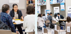 千里山キャンパス正門の左手にある新関西大学会館1階にて、就職や留学、教職、奨学金、また年金など、様ざまなテーマでの個別相談会を実施しました。