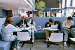 吹田みらいキャンパスは学生生活の快適さにも配慮して設計されています。キャンパス内には、前述のコモンズを中心に、一人でもグループでも集中して学べる空間を整備しています。ビジネスやデータサイエンスに関する専門書を探したいときは、図書館へ。図書館では、蔵書以外にも予約配送サービスを利用し、千里山をはじめとする他キャンパスの図書館の蔵書を取寄せることが可能です。また、コモンズ内にもビジネスやデータサイエンスに限らず、幅広い分野の書籍を揃えるなど、学生たちの知的好奇心を刺激する環境を整えています。
