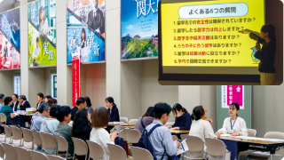 正門に隣接する新関西大学会館にて、留学や就職、奨学金、年金などの個別相談会を実施。寄せられた様ざまな質問に担当者が丁寧にお応えしました。