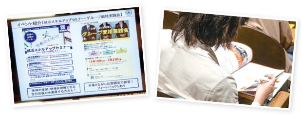 文系・理系の学部別に関西大学の就職状況、各業界の採用状況などを数値を交えて具体的に紹介。また、3年次生を対象にした就職支援セミナーや面談など、キャリアセンターが実施しているサポートの利用を促す情報を届けました。