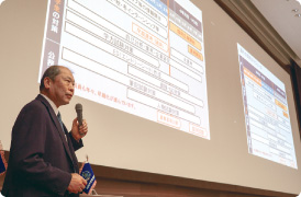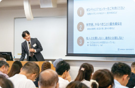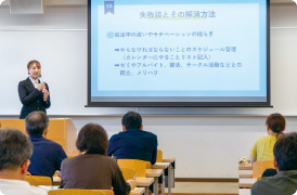 また、1年次生父母対象「キャリアデザインセミナー」では、大学のキャリアサポート体制に関する説明とともに、キャリア教育プログラムの開発・支援に取り組むOriginal Point株式会社の高橋政成氏による特別講演が行われました。企業が求める人物像や、働くことをポジティブに考えるプログラムについてわかりやすい説明がありました。