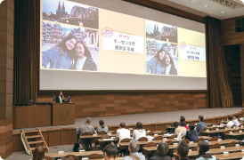 希望者を対象とした説明会を開催。留学に関しては、関西大学のさまざまなプログラムの紹介のほか、交換留学で人気が高いスウェーデンでの学び体験をはじめ、留学経験者たちの体験談などが紹介されました。