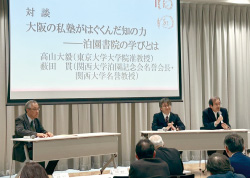 ついで泊園記念会名誉会長・本学名誉教授の藪田貫先生と高山先生の対談「大阪の私塾がはぐくんだ知の力──泊園書院の学びとは」が吾妻の司会のもとに行なわれ、大阪の学問・文化や泊園書院の特色につき新たな知見が示され、質疑応答もなされました。