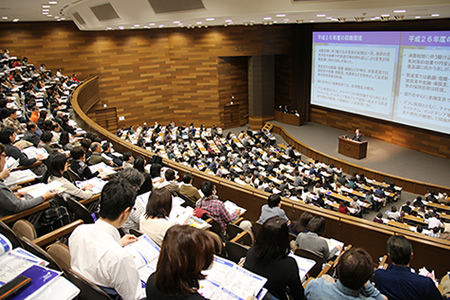 1年次生父母・保護者対象キャリアデザインセミナーの会場となった「BIGホール100」。2階席が埋まるほど多くの父母・保護者の皆さまが参加してくださいました。