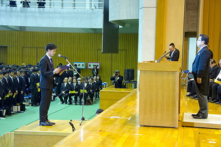 楠見晴重学長の前で、入学生総代が充実した4年間を送る決意を力強く宣誓しました。