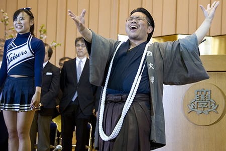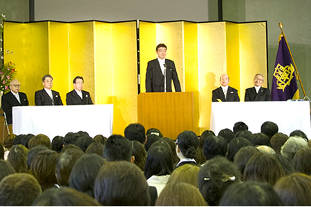 去る4月1日(水)、平成27年度関西大学入学式が挙行されました。満開の桜の下、13学部6,944名の新入生の大学生活がスタートしました。入学式では、在学生、卒業生の皆さんからのメッセージムービーの上映に続き、楠見晴重学長の式辞、入学生総代の宣誓の後、応援団による新入生歓迎セレモニーも実施され、新入生の新たな門出を祝いました。ここでは当日の様子をご紹介します。