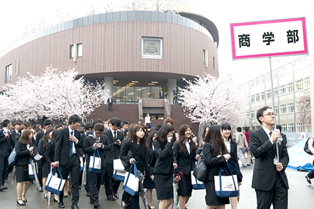 満開の桜咲く千里山キャンパスで行われた関西大学入学式。