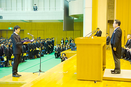 充実した大学生活への決意を込めて、入学生総代が力強く宣誓を行いました。