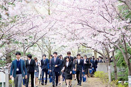 桜の下を歩く新入生の皆さん。彼らの門出を祝福するように、千里山キャンパスの桜も満開でした。