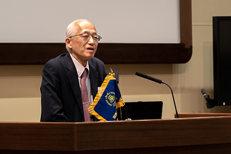 芝井学長が自身の体験談を交えながら、就職活動の実態や関西大学のキャリア支援の理念について語りました。