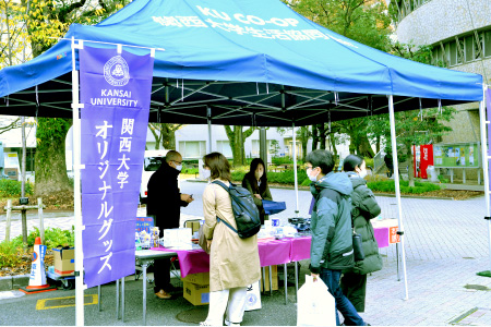 正門奥の時計台付近では、関西大学のオリジナルグッズ販売が行われ、父母の皆さまは笑顔でグッズを手にとられていました。