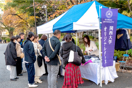 正門付近に、関西大学のオリジナルグッズを販売するブースが設置されました。マグカップや文房具、Tシャツなどが並ぶブースには、多くのご父母が集まりました。