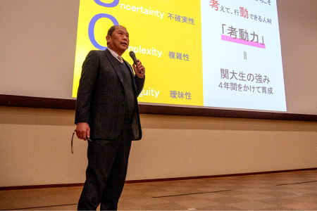 2024年10月に就任した高橋智幸学長が登壇し、近年の就職・進路実現の状況について説明したほか、関西大学の充実した就職サポートに期待してほしいことなどを語りました。