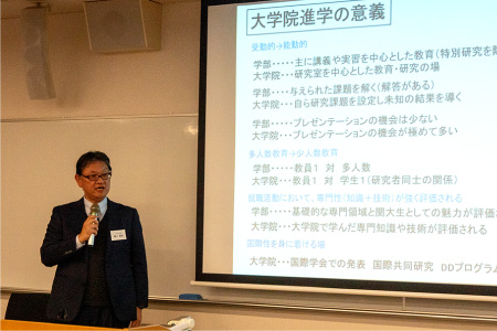 理工系学部を対象とした会場では、大学院進学に関する説明会が実施されました。大学院進学の意義や就職時のメリットをはじめ、具体的な入試情報などが紹介されました。
