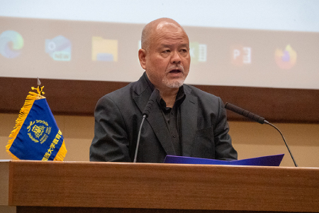 高橋智幸学長が登壇し、ご父母の日頃のご理解と支援への感謝を述べました。関西大学の充実した就職支援にも触れ、新しい道を切り拓く学生へのさらなる支援を呼びかけました。