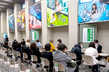 希望者を対象とした「就職個人面談」を実施。また別会場では留学や奨学金、国民年金の学生納付特例制度などに関する相談ブースも設け、さまざまな疑問や不安に対応しました。
